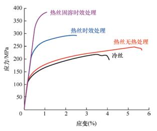 电弧增材制造技术可以缩短生产周期,降低成本,实现铝合金的快速成形,但存在结构内部含有较多气孔及晶粒粗大的问题。热丝辅助电弧增材制造(HWAAM)可以有效降低气孔率和细化晶粒,进一步提高电弧增材制造Al-Cu-Mg-Ag合金的性能。采用热丝电弧增材制造技术制备了Al-Cu-Mg-Ag耐热铝合金,利用拉伸试验、扫描电子显微镜(SEM)和透射电子显微镜(TEM)等实验方法,研究了电弧增材制造Al-Cu-Mg-Ag铝合金的气孔缺陷、显微组织和力学性能。结果表明,与冷丝成形合金相比,热丝辅助电弧增材制造Al-Cu-Mg-Ag合金气孔率降低25%,气孔球形度增加,空间分布较为均匀;同时晶粒尺寸降低30%,晶粒形貌趋于等轴晶化。冷丝结构件抗拉强度为218 MPa,屈服强度为134 MPa,延伸率为3.2%,使用热丝电弧增材制造后,力学性能提高,其抗拉强度提升至242 MPa,屈服强度提高至148 MPa,延伸率4.2%。最后,分别采用固溶+时效和人工时效热处理工艺,进一步改善了热丝辅助成形Al-Cu-Mg-Ag合金的力学性能。固溶与时效热处理后抗拉强度达到368 MPa,延伸率下降至0.5%,时效热处理后强度达到297 MPa,延伸率2.1%。
